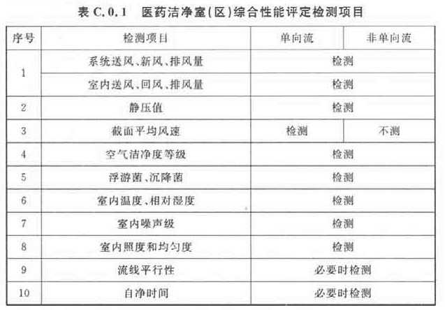 4 醫藥潔凈室(區)的綜合性能確認,應包括表C.0.1項目的檢測和評價。