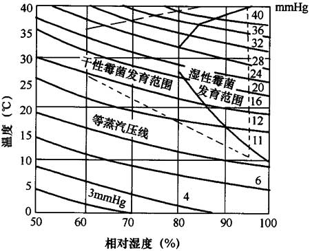 6.2.7、6.2.8 本節對圍護結構內表面抗菌涂飾工程進行了規定,由于在食品工業用房內使用抗菌涂飾工程目前在國內外意見不太統一,擔心抗菌產品會使食品中產生抗藥性菌株,但對于濕度經常超過75%或有蒸汽作業的房間或關鍵區域的抗菌防霉問題,目前仍沒有更好的解決辦法,內表面抗菌有很多方法,如消毒,但本規范僅對使用抗菌涂料的情況進行了規定。當相對濕度達到80%時,不論溫度高低,基本上都要發霉,見圖4,所以此時可涂防霉涂料。
