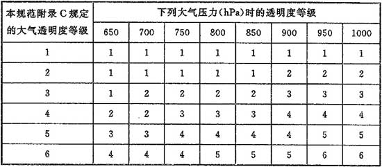 4.3.4 采用本規范附錄C和附錄D時,當地的大氣透明度等級應根據本規范附錄E及夏季大氣壓力按表4.3.4確定。